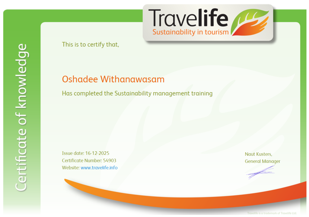 At Globeenjoy Tours, sustainability is embedded into how we design and deliver our travel experiences. As part of our commitment to responsible and sustainable tourism, our CEO, Oshadee Withanawasam, has successfully completed the Travelife Sustainability Management training.